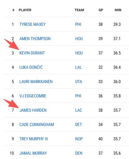 据统计,本赛季至今,杜兰特出战37场,场均出战36.5分钟,排名联盟第三;而哈登出战38场,场均出战35.7分钟,排名联盟第7。