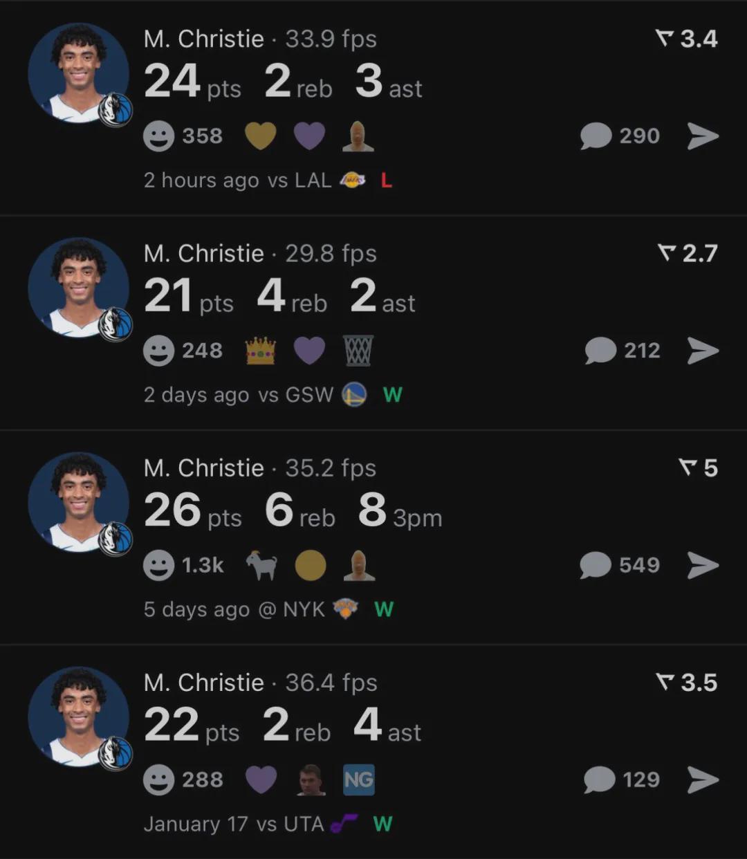 独行侠球员马克斯-克里斯蒂连续四场砍下20+,这四场比赛他场均23.3分3.5篮板2.8助攻,投篮命中率51.7%,三分命中率52.6%,罚球命中率91.7%。克里斯蒂四场一共投进20记三分,场均能命中5记,外线火力凶猛。